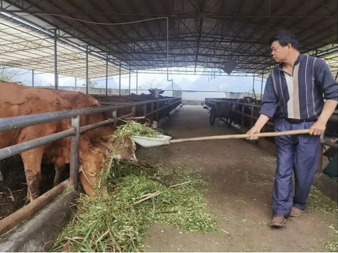广西崇左市天等县驮堪乡犇犇养牛合作社作业人员在喂牛(央广网发 文雁 摄)