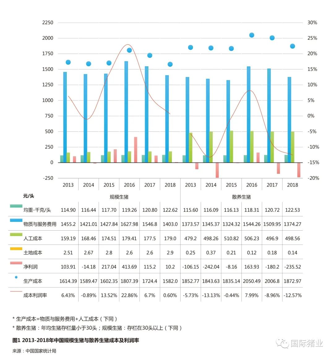 国家统计局多个方面数据显示,从2013年到2018年,中国规模生猪和散养生猪的生产所带来的成本有着同样的变化趋势,在2014年出现小幅下降外,从2016年升至高点后,一路开始年年在下降。从变化趋势图可以大致看出,从2013年到2018年,规模生猪比散养生猪的每头成本大约平均低250元,但二者每头猪的主产品均重比较接近,且呈现逐年增加趋势,2018年达到头均122.5千克左右。
