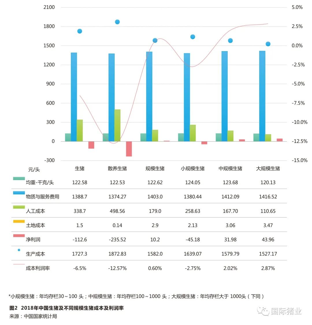 数据显示,2018年,中国规模生猪的生产所带来的成本为1582.0元/头,比2017年的1724.4元下降142.4元;同年,散养生猪的生产所带来的成本为1872.97元/头,比2017年的2006.8元下降133.83元(见图1)。比较来看,二者生产所带来的成本主要差距来自于人工成本,散养生猪人工成本比规模生猪高出约300元/头,但二者近年来人工成本均持续增加。然而,净利润差别更大,2018年,散养生猪每头亏损超过235元,而规模养猪却实现盈利,每头净利润约10元,小规模生猪每头亏损约45元,中规模、大规模生猪每头净利润分别约为32元、44元。