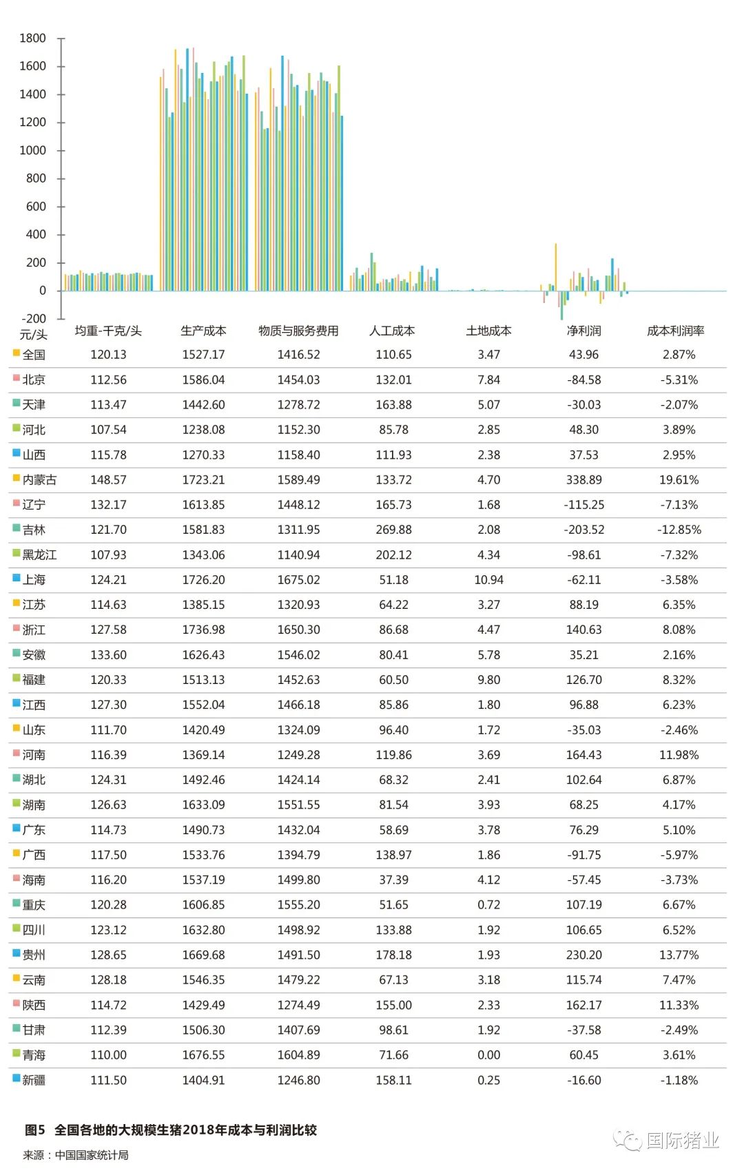 从全国各地的大规模生猪在2018年的生产所带来的成本与利润来看,浙江(1737元/头)、上海(1726元/头)、内蒙古(1723元/头)的生产所带来的成本明显高于别的地方,而利润较高的地区有内蒙古(339元/头)、贵州(230元/头)、河南(164元/头)、陕西(162元/头)、浙江(141元/头),亏损较大的地区有东北三省,吉林、吉林、辽宁、黑龙江分别亏损204元/头、115元/头、99元/头,这主要是受非洲猪瘟疫情影响,其次亏损较大的地区还有海南、广西、北京等。